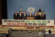 뉴한국방송뉴스통신사 신유철기자 기자 | 경기 연천군, 가평군, 인천 강화군, 옹진군 4개 기초자치단체는 27일 국회 소통관에서 기자회견을 열고, 정부가 균형성장을 위해 추진하는 지방 우선 정책 분야에 경인지방 인구감소지역을 포함해 달라고 촉구했다. 최근 발표된 지방 살리기 상생소비 활성화 방안 등 일부 정책이 비수도권 대상의 지방 우선 정책으로 수립됐다. 이에 경인지방 4개 인구감소지역은 수도권에 가려진 ‘보이지 않는 지역’이 아니라, 국가 균형발전의 최전선에서 고통받고 있는 지역이라는 점을 강조하며 지방 우선 정책에 포함해 달라고 공동 건의했다. 연천, 가평, 강화, 옹진 4개 인구감소지역은 한국전쟁 이후 70여 년간 국가안보를 위해 특별한 희생을 감내한 접경지역이면서, 저출산, 고령화 및 인구 유출 등 지방소멸 위기를 겪고 있는 곳이다. 하지만, 수도권정비계획법상 수도권에 해당한다는 이유로 그동안 각종 정부 지원 정책에서 배제됐다. 김덕현 연천군수는 “국가안보와 분단의 아픔을 감내한 연천군 등 접경지역은 특별한 희생을 겪고 있는 지역으로, 수도권임에도 인구감소지역으로 지정된 것은 연천군이 감내한