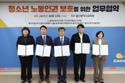 뉴한국방송뉴스통신사 신유철기자 기자 | 울산광역시교육청은 12일 오후 2시 접견실에서 관계 기관과 울산지역 청소년의 노동 권익 보호와 노동환경 개선을 위한 업무협약을 맺었다. 협약에는 (사)한국공인노무사회, 북구비정규직노동자지원센터, 울산광역시동구비정규직노동자지원센터, 울산근로자이음센터가 참여했다. 이번 협약은 청소년이 안전하고 존중받는 노동환경 속에서 성장할 수 있도록 지역사회와 함께 노동 권익 침해를 예방하고, 종합적인 지원 체계를 마련하고자 추진됐다. 이들 기관은 청소년 노동 문제 무료 상담, 상호 정보 공유와 협력 강화, 기관 간 관계망 활성화, 지역사회 연계 노동인권 사업 추진 등에서 긴밀히 협력하기로 했다. 울산교육청은 이번 협약으로 청소년들이 노동환경 문제에 대해 올바른 실천 의식을 기를 수 있도록 지원하는 한편, 실제 취업 현장에서 겪을 수 있는 권익 침해 상황에 효과적으로 대응할 수 있도록 돕는 데 중점을 둘 예정이다. 또한 학생인권지원센터와 협약 기관이 공동으로 노동 상담 업무를 맡아 학생 노동 문제 해결을 위한 체계적인 지원을 강화할 계획이다. 아울러 전
