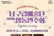 뉴한국방송뉴스통신사 신유철기자 기자 | 부산 남구는 오는 11월 2일 오후 17시 부산문화회관 대극장에서‘남구립예술단 합동 연주회 Together, We Sing’을 개최한다. 남구립예술단은 ▲소년소녀합창단(지휘 김주곤) ▲오륙도여성합창단(지휘 곽기웅) ▲욜드합창단(지휘 고영호)으로 구성되어 있으며, 남구를 대표하는 문화사절단으로 활발히 활동하고 있다. 이번 연주회는 남구청 개청 50주년을 기념하여 세 합창단이 처음으로 함께하는 합동 연주회라는 점에서 특별한 의미를 지닌다, 각 합창단의 개성과 감성을 담은 다채로운 무대를 통해 관객에게 풍성한 음악적 경험을 선사할 것으로 기대된다. 소년소녀합창단은 맑고 순수한 목소리로 음악극‘푸른 하늘 은하수’를 선보이고, 오륙도여성합창단은 ‘그리움 그리고 사랑’이라는 테마로 세대를 이어주는 따뜻한 감성의 하모니를 들려주며, 욜드합창단은 인생의 깊이와 여운이 느껴지는 ‘행복한 인생’이라는 감동의 무대를 마련했다. 특히 이번 공연의 하이라이트는 세 합창단이 함께 꾸미는 합동무대다. 서로 다른 세대의 목소리가 한 무대에서 하나의 선율로 어우러지며, 노래를 통해 마음을