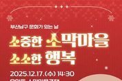 뉴한국방송뉴스통신사 신유철기자 기자 | 부산 남구는 오는 12월 17일 오후 2시 30분, 우암동 소막마을 주택에서 2025 남구 문화가 있는 날 '소중한 소막마을, 소소한 행복' 공연을 개최한다고 밝혔다. 이번 공연은 역사적 의미가 담긴 소막마을 주택을 지역 문화공간으로 활용하여, 주민들이 일상에서 자연스럽게 문화예술을 접할 수 있도록 마련됐다. 무대는 마술 풍선쇼, 합창, 퓨전국악, 트로트 등 다양한 장르로 구성되어 남녀노소 누구나 부담 없이 즐길 수 있는 무대로 꾸며진다. 특히 소막마을 주택의 아늑한 분위기가 더해져 ‘작지만 소중한 행복’을 나누는 따뜻한 연말 공연이 될 것으로 기대된다. 오은택 남구청장은 “일상 가까이에서 이웃과 함께 문화를 즐기는 경험은 지역 공동체의 정서 교류에 큰 의미가 있다”며 “많은 분이 오셔서 따뜻한 무대와 즐거운 공연을 함께하시길 바란다”고 전했다. [뉴스출처 : 부산시남구]