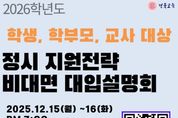 뉴한국방송뉴스통신사 신유철기자 기자 | 경북교육청은 15일과 16일 양일간, 2026학년도 정시모집 지원을 대비하기 위해 ‘2026학년도 정시 지원전략 비대면 대입 설명회’를 운영한다고 밝혔다. 이번 설명회는 2026학년도 정시모집을 준비하는 학생과 학부모․교사에게 대학수학능력시험 분석 자료와 수도권·지역거점대학 등의 정시모집 정보를 제공해 지원전략 수립을 돕기 위해 마련됐다. 특히, 진학지도가 필요한 교사뿐 아니라, 실제 지원을 해야 하는 학생과 학부모님들에게도 기회를 제공하여, 불수능의 영향으로 혼란을 겪고 있을 경북 지역 학생과 학부모 모두에게 유익한 정보를 제공할 수 있을 것으로 기대된다. 양일간 진행되는 설명회는, 15일 19시에는 ‘2026학년도 대학수학능력시험 실시 결과와 수도권 15개 대학 정시모집 지원전략’을, 16일 19시에는 ‘수도권 대학, 지역거점국립대 및 지역 대학 정시 지원전략’을 주제로 운영되며, 참가자는 관심 분야에 맞는 설명회를 사전 선택해서 참여할 수 있다. 설명회는 ZOOM을 활용한 온라인 방식으로 진행되며, 참가 신청은 경북진학지원센터 누리집을 통해 가능하다. &