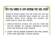뉴한국방송뉴스통신사 김성의 기자 | 전라남도교육청과 전라남도가 광주·전남 대통합과 교육 대전환을 위한 공동선언문을 발표했다. 김대중 교육감과 김영록 지사는 8일 오전 전남도청에서 만나 최근 논의되고 있는 광주·전남 통합과 관련, “지역 소멸 위기를 넘어 광주·전남 대통합을 주도하고, 대한민국의 새로운 성장축이 될 ‘(가칭) 광주전남 특별시’ 출범이 역사적 사명임을 깊이 공감한다.”며 이같이 선언했다. 전남교육청은 4개 항으로 된 선언문에서 지역 소멸 위기 극복을 위한 광주·전남 대통합에 적극 찬성하며, 통합 특별시의 성공적인 안착을 위해 전남도와 긴밀히 협력하기로 했다. 이어, ‘광주·전남 행정통합 추진협의체’에 핵심 주체로 참여하여, 선진형 초광역 통합모델을 구축하는 데 협력하기로 했다. 또한, 전남교육청은 교육·학예 분야와 관련된 사항에 대해 광주광역시교육청과 함께 법안 작성 및 검토에 앞장서기로 했다. 이와 함께, 전남교육청과 전남도는 통합 과정에서 교육 현장의 목소리를 반영하며, 교육 현장이 체감할 수 있는 교육 대전환과 미래 인재 양성을 위해 모든 역량을 결집한다는 데 합의했다