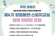 뉴한국방송뉴스통신사 신유철기자 기자 | 양평군은 관내 초등학생의 논리적 사고와 발표 능력 향상을 위해 오는 4월 3일부터 ‘제4기 양평웅변·스피치교실’을 운영한다. 이번 프로그램은 어린이들이 대중 앞에서 자신의 생각을 논리적으로 표현하고 발표에 대한 자신감을 기를 수 있도록 마련된 교육 과정이다. 교육은 4월 3일부터 6월 26일까지 총 13주 과정으로 진행되며, 매주 금요일 오후 3시부터 4시 20분까지 양평군 평생학습센터 2층 대회의실에서 열린다. 6월 27일에는 그동안 배운 내용을 발표하는 발표대회도 평생학습센터 4층 온누리실에서 진행될 예정이다. 양평웅변·스피치교실은 관내 웅변·스피치 분야의 강사인 백현진 강사의 재능기부로 운영되며, 관내 초등학생이면 누구나 참여할 수 있다. ‘제4기 양평웅변·스피치교실’ 참여 접수 기간은 3월 16일 오전 9시부터 3월 20일 오후 6시까지이며, 희망자는 홍보문에 있는 정보 무늬(QR 코드)를 통해 온라인으로 신청할 수 있다. [뉴스출처 : 경기도 양평군]