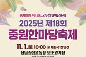 뉴한국방송뉴스통신사 신유철기자 기자 | ‘제18회 중원한마당축제’가 오는 11월 1일 오전 10시부터 오후 2시 30분까지 2000여 명이 참석한 가운데 성남종합운동장 보조경기장에서 열린다. 성남시 중원구가 후원하고, 중원한마당축제 추진위원회가 주최·주관해 열리는 이번 행사는 ‘중원에서 하나로, 모두의 한마당 축제’를 주제로 진행된다. 이날 특설무대에선 11개 동 주민 대표가 출연해 넘치는 끼와 노래 실력을 선보이는 ‘우리 동네 인기스타’ 공연이 펼쳐진다. 초청 가수 윤수현의 ‘천태만상’ 등 트로트 공연, 신인 아이돌 걸그룹 아스텔의 ‘슈퍼노바’, ‘아일랜드’ 등의 공연, 중원유스센터 청소년 보컬 동아리와 댄스 동아리 공연도 열려 축제 분위기를 달군다. 시민 체험 행사도 다양하다. 행사장 곳곳에 총 11개 체험 부스를 설치해 4차산업과 관련한 드론 축구, 가상현실(VR) 트럭 체험, 배틀 로봇 등과 페이스페인팅, 목공 체험 등을 해볼 수 있다. 중원구 관계자는 “주민 간 화합을 도모하고, 신나고 활기찬 지역 분위기를 조성하는 장이 될 것”이라고 말했다. [뉴스출처 : 경