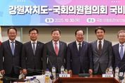 뉴한국방송뉴스통신사 신유철기자 기자 | 김진태 강원특별자치도지사는 10월 30일 오후 2시, 국회 의원회관에서 도내 지역구 국회의원 7명과 함께 도 국회의원협의회를 열고 2026년도 국비 추가 확보 방안 등을 논의했다. 이번 간담회는 2026년도 정부예산안의 국회 심의가 본격화되는 시점에 맞춰 도와 지역 국회의원 간 협력체계를 강화하기 위해 마련된 자리로, 김 지사를 비롯해 지역구 국회의원 보좌진이 참석해 예산 확보 전략을 중심으로 실무적인 논의를 진행했다. 이 자리에서 도는 올해 국비 10조 원 시대를 처음으로 연 성과를 바탕으로 정부 예산안에 미반영된 24개 사업(총 612억 원)의 국비 추가 확보 방안을 논의하고, 해당 사업들이 국회 심의 과정에서 반드시 반영될 수 있도록 국회의 적극적인 협력을 요청했다. 이와 함께 ▲용문~홍천 광역철도 예타 통과 ▲삼척~강릉 고속화철도 예타 통과 ▲포천~철원 고속도로 예타 통과 ▲소양8교 건설 국비 반영 ▲제5차 국가철도망 구축계획 및 제6차 국도‧국지도 건설계획 최대 반영 등 강원지역 주요 에스오시(SOC) 현안과제에 대해서도 폭넓은 논의가 이뤄졌다. 한기