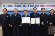 뉴한국방송뉴스통신사 신유철기자 기자 | 울산광역시교육청과 울산동구청은 남목 도시재생 사업에 따라 동구 남목초등학교에 조성되는 공영주차장·어울림센터를 학교와 지역이 함께 사용하는 복합 공동생활(커뮤니티) 센터로 확대 개편하기로 했다. 울산교육청과 동구청은 10일 이 같은 내용을 담은 ‘남목 도시재생 사업과 학교시설 복합화 조성을 위한 변경 협약’을 맺었다. 이번 변경 협약은 2023년 9월 합의된 150면 규모 공영주차장과 학교 밖 관사 부지 어울림센터 조성을 지역과 학교가 공동 활용하는 통합형 복합시설로 재구조화하는 내용이 핵심이다. 교육청, 지자체, 학교가 협력해 교육, 돌봄, 문화 기능을 한 공간에 구축하는 ‘학교시설복합화’ 추진 목적에 맞춰 사업이 전면 재설계됐다. 변경된 계획에 따르면 기존 지하 2층 중심의 공영주차장 계획은 지하 1층부터 지상 3층까지 총면적 5,148㎡ 규모의 복합시설로 개편되며, 2027년 12월 준공 예정이다. 조성되는 시설은 102면 규모의 공영주차장, 지역주민을 위한 1, 2층 복합 공동생활 센터, 남목초등학교 전용 3층 교육시설로 구성된다.