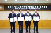 뉴한국방송뉴스통신사 권영분기자 기자 | 충주시는 31일 시청 중회의실에서 2027년 하계세계대학경기대회의 성공적인 개최와 문화예술 발전을 위해 국립한국교통대학교, 건국대학교 글로컬캠퍼스, 충주시체육회와 공식 업무협약을 체결했다. 이번 협약은 지역 주요 체육관과 충주문화회관의 리모델링 공사로 경기장과 문화시설 활용이 일시적으로 제한됨에 따라, 지역 대학교 시설을 비롯한 각종 지원 협력을 공식화하기 위해 마련됐다. 협약식에는 조길형 충주시장, 윤승조 국립한국교통대학교 총장, 최영근 건국대학교 글로컬캠퍼스 부총장, 진용섭 충주시체육회장 등이 참석해 전문체육 및 생활체육 활성화, 문화예술 발전 등을 위한 협력 강화, 협약 기관 간 인적 인프라 지원 등 다양한 분야에서 협력하기로 뜻을 모았다. 협약을 통해 각 기관의 체육관 등 시설 대관 시 적극적인 협조를 받고, 주요 행사 진행 시 기관 간 자원봉사 등 인프라 지원이 이뤄질 것으로 기대된다. 조길형 시장은 “2027년 U대회 성공 개최와 문화예술 발전을 위해 모두가 한 데 힘을 모으는 좋은 계기가 마련됐다”라며, “이번 U대회는 대학생들과 지역사회 모두가