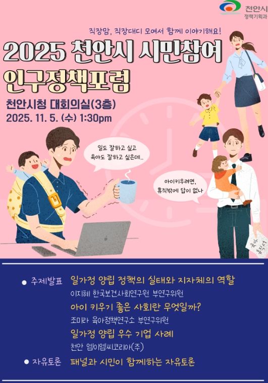 뉴한국방송뉴스통신사 신태공 기자 | 천안시는 다음 달 5일 시청 대회의실에서 ‘2025 천안시 시민참여 인구정책포럼’을 개최한다.