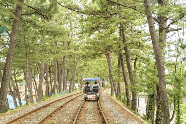 삼척해양레일바이크는 일제강점기에 건설을 시작했다가 중단된 철로를 활용해 근덕면 궁촌리에서 용화리까지 5.4km 구간을 복선으로 운행하고 있다. 국내에서 유일하게 바다와 해송 숲을 동시에 조망할 수 있는 코스로, 푸른 동해의 해안선을 따라 펼쳐지는 절경과 울창한 곰솔 숲, 그리고 루미나리에와 레이저 쇼가 연출되는 환상적인 3개의 터널을 지나며 약 1시간 동안 특별한 경험을 선사한다.