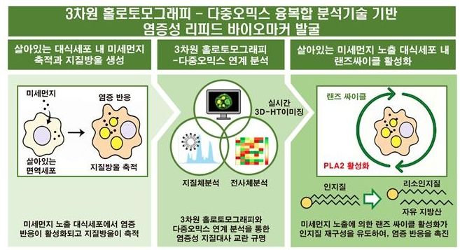 4일 전남대에 따르면 이번 연구는 3차원 홀로토모그래피(3D-holotomography)와 다중오믹스(multi-omics) 분석 기술을 통합해, 살아 있는 대식세포(macrophage) 내부에서 미세먼지 노출로 인한 대사 변화를 실시간으로 관찰한 최초 사례로 평가된다.