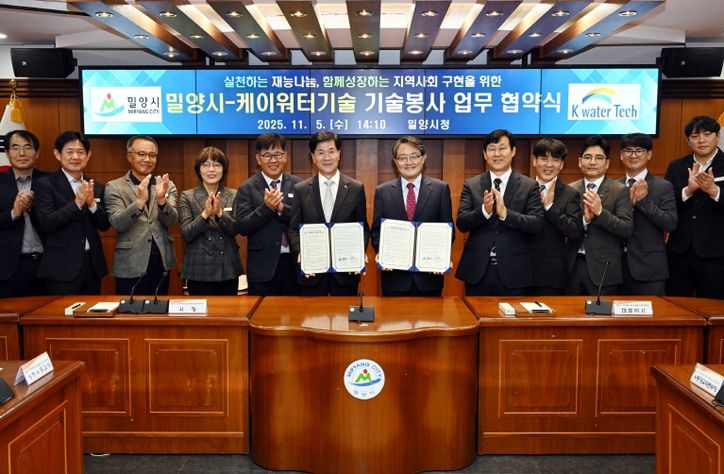 뉴한국방송뉴스통신사 신유철기자 기자 | 경남 밀양시와 케이워터기술(주)(대표 정승용)은 5일 시청 소회의실에서 ‘실천하는 재능나눔, 함께 성장하는 지역사회 구현을 위한 기술봉사 업무협약’을 체결했다고 밝혔다.