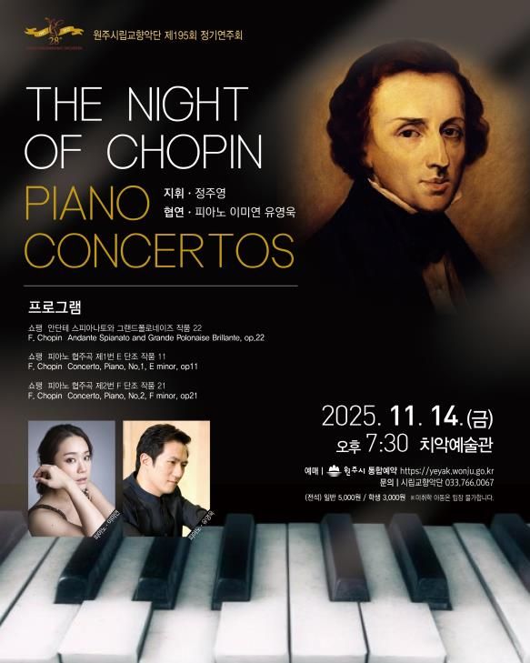뉴한국방송뉴스통신사 양호선기자 기자 | 원주시립교향악단은 오는 14일 오후 7시 30분, 치악예술관에서 제195회 정기연주회 ‘The Night of CHOPIN’을 개최한다.