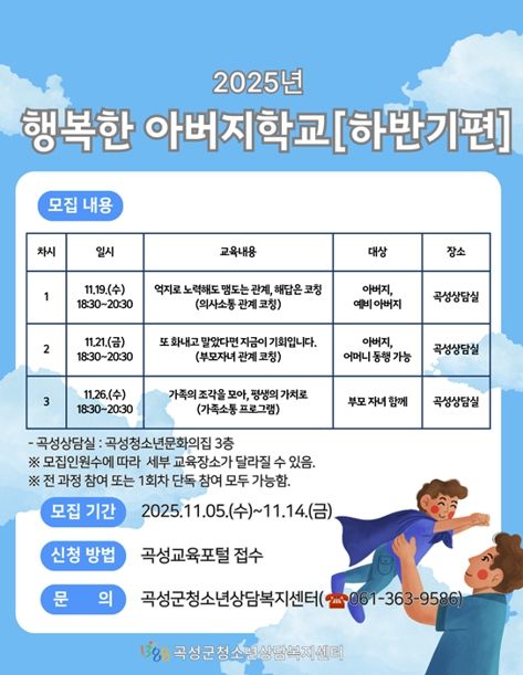 뉴한국방송뉴스통신사 신다은기자 기자 | 곡성군청소년상담복지센터가 지역 사회 아버지들(지역 청년회 등)의 요구 분석을 통해 가족 내 소통 역량 증진을 위한 부모교육 프로그램 ‘행복한 아버지학교’ 제10기 참가자를 모집한다고 10일 밝혔다.