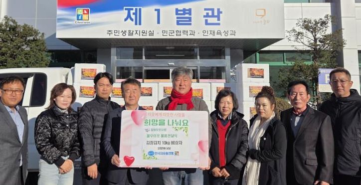 뉴한국방송뉴스통신사 양호선기자 기자 | 한국자유총연맹 철원군지회가 지난 7일 양구군 2025 양구 펀치볼 김장나눔축제 행사장에 모여 직접 담근 사랑의 김장김치 10kg, 80상자(370만원 상당)를 10일 철원군청 주민생활지원실 앞에서 나눔 전달식을 가졌다