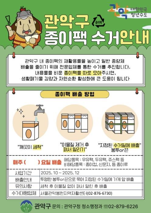 뉴한국방송뉴스통신사 신유철기자 기자 | 관악구가 오는 12월 말까지 ‘종이팩 중점 수거사업’을 집중적으로 추진하여, 종이팩의 재활용률을 높이고 일반 종량제 배출을 줄이는데 주력한다.
