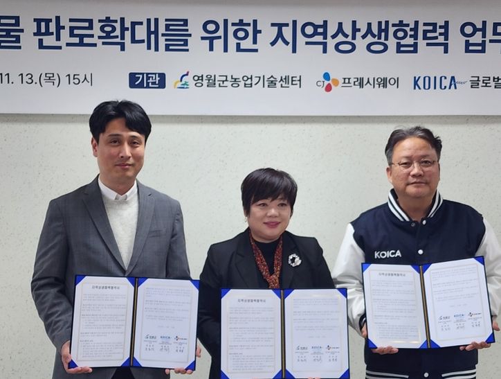 뉴한국방송뉴스통신사 양호선기자 기자 | 영월군농업기술센터는 2025년 11월 13일 목요일 오후 3시, 영월군농업기술센터 2층 회의실에서 CJ프레시웨이, KOICA글로벌인재교육원과 함께 지역상생협력 업무협약을 체결했다.