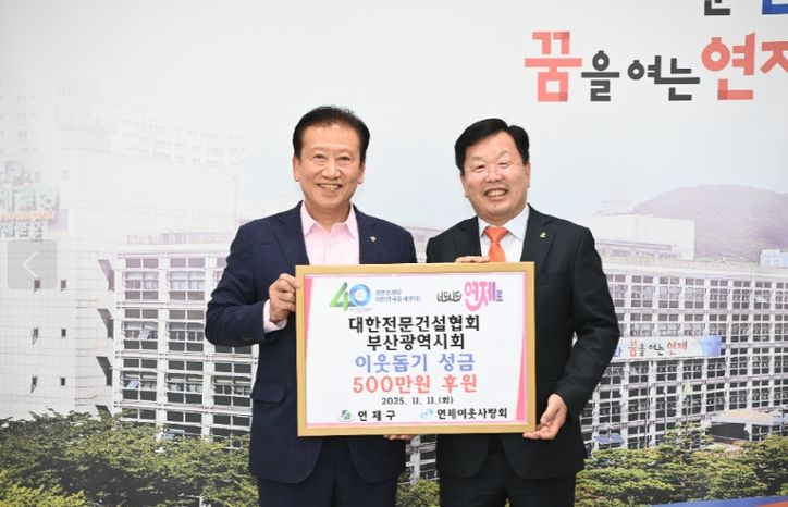 뉴한국방송뉴스통신사 신유철기자 기자 | 연제구는 11월 11일 대한전문건설협회 부산광역시회(회장 김형겸)로부터 이웃돕기 성금 500만원을 기탁 받았다. 기탁 받은 성금은 취약계층 지원을 위한 사업에 이용될 예정이다.