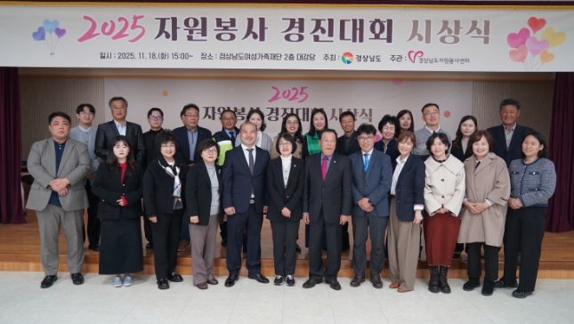 뉴한국방송뉴스통신사 신유철기자 기자 | 경상남도는 18일 경남여성가족재단 대강당에서 ‘2025 자원봉사 경진대회 시상식’에서 지역사회 자원봉사 활성화에 기여한 29개 팀에 도지사상을 수여했다고 밝혔다.