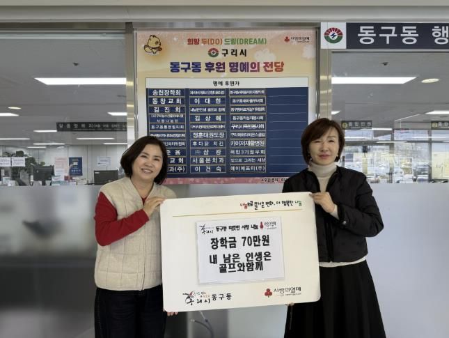 뉴한국방송뉴스통신사 신유철기자 기자 | 구리시 동구동 행정복지센터는 지난 18일 동구동 행정복지센터 대회의실에서 '내 남은 인생은 골프와 함께' 모임으로부터 관내 취약계층 청소년을 위한 장학금 70만 원을 기탁받았다고 밝혔다.