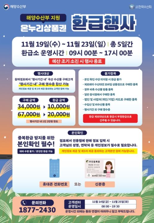 환급 절차는 국내산 신선 수산물을 구매 → 점포주가 간편환급시스템에 구매내역 등록 → 상품권 환급 부스 방문 → 구매 내역 및 본인 확인 후 상품권 수령 4단계로 진행된다.