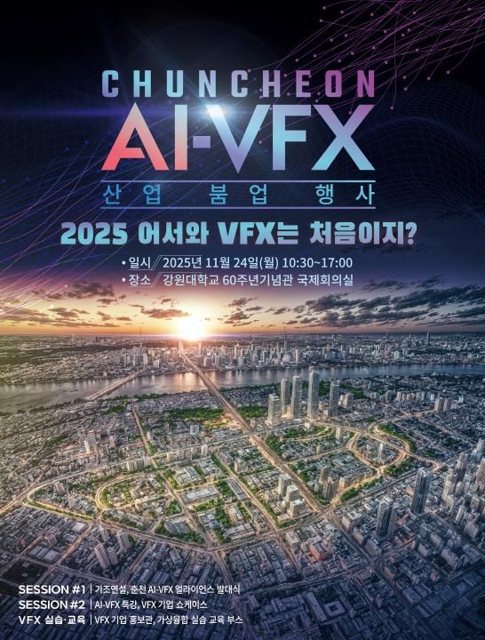 뉴한국방송뉴스통신사 신유철기자 기자 | 춘천시는 2025년 11월 24일 강원대학교 60주년 기념관 국제 회의실에서 ‘춘천 AI-VFX 산업붐업행사 – 2025 어서와! VFX는 처음이지?’를 개최한다고 밝혔다.