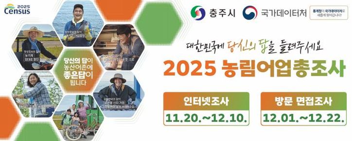 뉴한국방송뉴스통신사 권영분기자 기자 | 충주시는 오는 12월 22일까지 한 달여간 ‘2025년 농림어업총조사’를 실시한다고 밝혔다.
