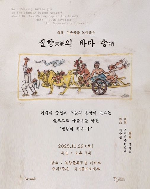 뉴한국방송뉴스통신사 신유철기자 기자 | 서귀포시 정방동은 11월 29일, 서귀포시 중앙로 13 복합문화공간 워크라운지에서 '대향, 이중섭을 노래하다 ‘실향의 바다 송’' 문화·예술 공연을 개최한다고 밝혔다.