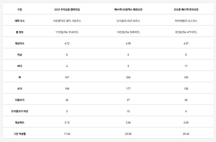 ‘2025 우리금융 챔피언십’의 우승자인 이태훈(35.캐나다)은 1라운드부터 최종라운드까지 11번홀에서 1타만을 잃었다. 2라운드에는 보기를 범했지만 1라운드와 3라운드, 최종라운드에서는 모두 파로 막아냈다.