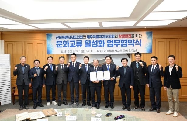 뉴한국방송뉴스통신사 신유철기자 기자 | 제주특별자치도의회는 12월 1일 오후 14시 전북특별자치도의회 의장실(의장 문승우)에서 전북특별자치도의회와 문화교류 활성화 및 지역 상생발전을 위한 업무협약(MOU)을 체결했다고 밝혔다.