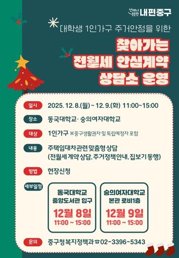 상담소는 △12월 8일에 동국대학교 △12월 9일 숭의여자대학교에서 각각 오전 11시부터 오후 3시까지 운영된다. 중구에 거주하거나 생활권을 둔 대학생 1인 가구뿐 아니라 독립을 준비하는 학생도 별도 예약 없이 현장에서 바로 상담을 받을 수 있다.