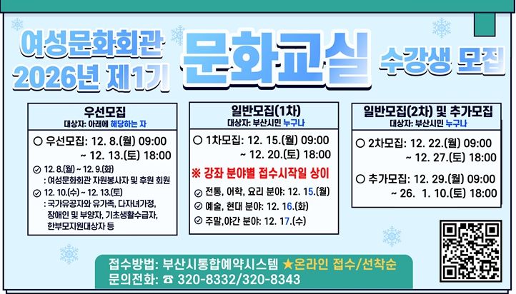 뉴한국방송뉴스통신사 신유철기자 기자 | 부산시 여성문화회관은 오는 내일(8일)부터 '2026년 제1기 문화교실' 수강생을 모집한다고 밝혔다.