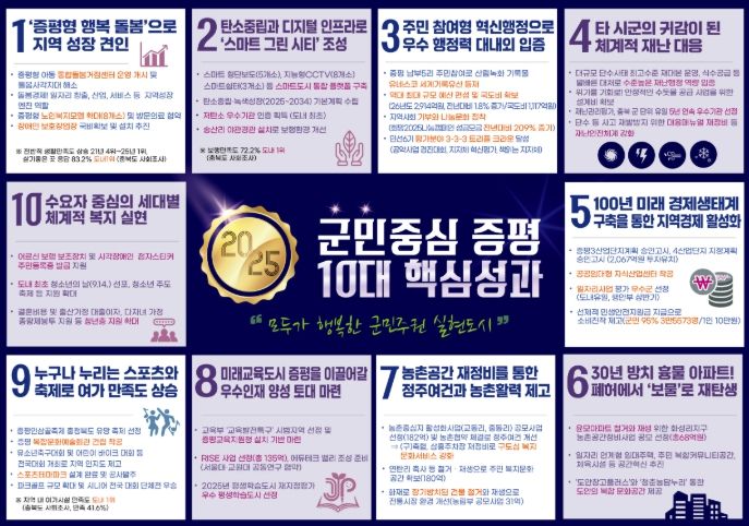 군이 발표한 10대 성과는 △‘증평형 행복 돌봄’으로 지역 성장 견인 △스마트 그린시티 조성 △주민 참여형 혁신 행정으로 우수 행정력 대내외 입증 △체계적 재난 대응 △100년 미래 경제생태계 구축 △30년 방치 윤모아파트의 재탄생 △농촌공간 재정비를 통한 정주 여건 개선 △미래교육도시 기반 마련 △누구나 누리는 스포츠·축제로 여가 만족도 상승 △수요 중심 세대별 체계적 복지 실현 등이다.