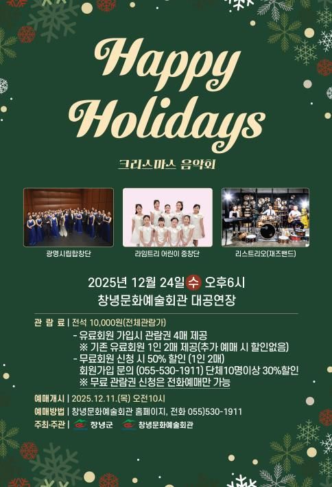 뉴한국방송뉴스통신사 신유철기자 기자 | 창녕군은 오는 24일 오후 6시 창녕문화예술회관 대공연장에서 온 가족이 함께 즐길 수 있는 기획공연 ‘크리스마스 음악회’를 개최한다고 밝혔다.