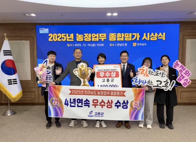 뉴한국방송뉴스통신사 신다은기자 기자 | 고흥군이 전라남도가 주관한 ‘2025년 농정업무 종합평가’에서 4년 연속 ‘우수상’을 수상하며, 농업 강군(强郡)으로서의 위상을 다시 한번 입증했다.