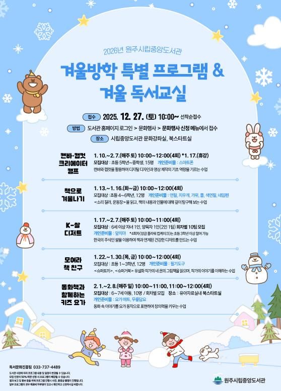 뉴한국방송뉴스통신사 양호선기자 기자 | 원주시립중앙도서관은 겨울방학을 맞아 유아부터 청소년을 대상으로 겨울방학 특별 프로그램과 겨울 독서교실을 운영한다.