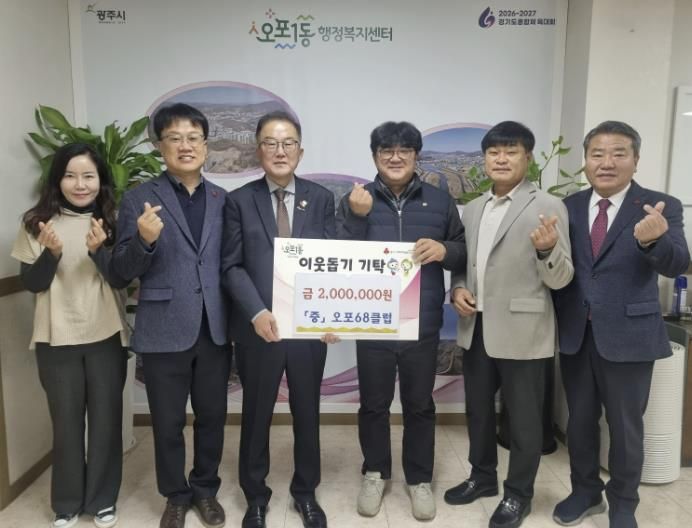 오포68클럽은 지역사랑 봉사 활동을 목적으로 오포 권역 내 1968년생을 주축으로 2004년 결성된 친목 단체다. 이번에 기탁된 성금은 오포 권역 4개 동(오포1·2동, 능평동, 신현동)의 취약계층을 지원하는 데 사용될 예정이다.