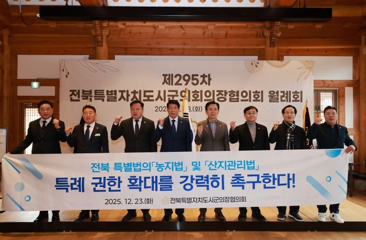 뉴한국방송뉴스통신사 신다은기자 기자 | 지난 23일 무주 태권도원에서 열린 전북특별자치도 시군의회의장협의회(회장 남관우 전주시의회 의장) 월례회에서 손종석 순창군의회 의장이 건의한 전북특별법 핵심 특례인 '농지법'과 '산지관리법'의 실효성 확보를 위한 권한 확대를 촉구하는 건의안이 채택됐다.