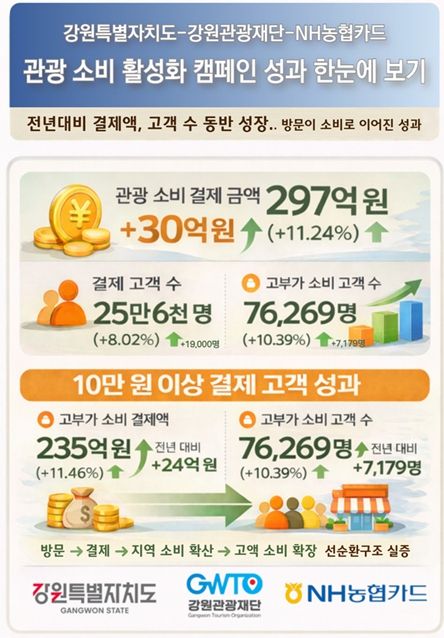 재단이 집계한 캠페인 성과 분석 결과, 2025년 11월 12일부터 12월 15일까지 도내 관광 관련 가맹점에서 발생한 NH농협카드 결제 금액은 약 297억 원으로, 전년 동기 대비 30억 원(11.24%) 증가했다.