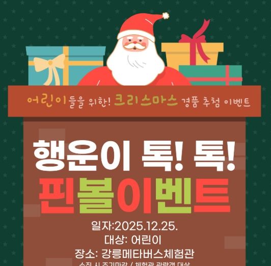 뉴한국방송뉴스통신사 양호선기자 기자 | 강릉과학산업진흥원은 12월 25일 크리스마스를 맞아 강릉 메타버스 체험관에서 어린이들을 대상으로 한 특별 크리스마스 이벤트를 개최한다고 밝혔다.