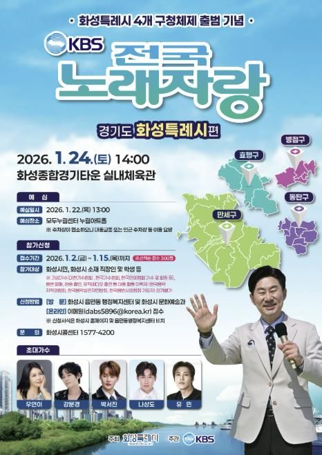 뉴한국방송뉴스통신사 신유철기자 기자 | 화성특례시는 다음 달 2일부터 15일까지 ‘KBS 전국노래자랑’ 화성특례시편 참가자를 모집한다고 24일 밝혔다.