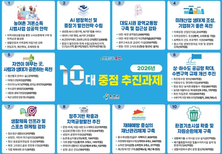 뉴한국방송뉴스통신사 권영분기자 기자 | 옥천군이 26일 2026년 군정 운영의 핵심 방향을 담은 10대 중점 추진과제를 발표하고, 군민 삶의 질 향상과 지속가능한 지역성장을 위한 정책 추진에 나선다.