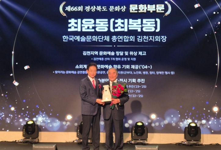 뉴한국방송뉴스통신사 신유철기자 기자 | 김천시는 지난 23일 안동 스탠포드호텔에서 열린 제66회 경상북도 문화상 시상식에서 최복동 한국예총 김천지회장(문화 부문), 김대철 도문요 대표(시각예술 부문)가 각각 수상했다고 밝혔다.