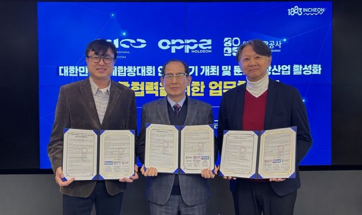 뉴한국방송뉴스통신사 신유철기자 기자 | 인천관광공사(사장 유지상)와 대한민국국제합창대회 조직위원회(위원장 김희철), ㈜놀던오빠들(대표 김준호)은 26일 인천관광공사에서 ‘대한민국국제합창대회 인천 개최(2026년~2030년) 및 문화관광 활성화’를 위한 업무협약을 체결했다.