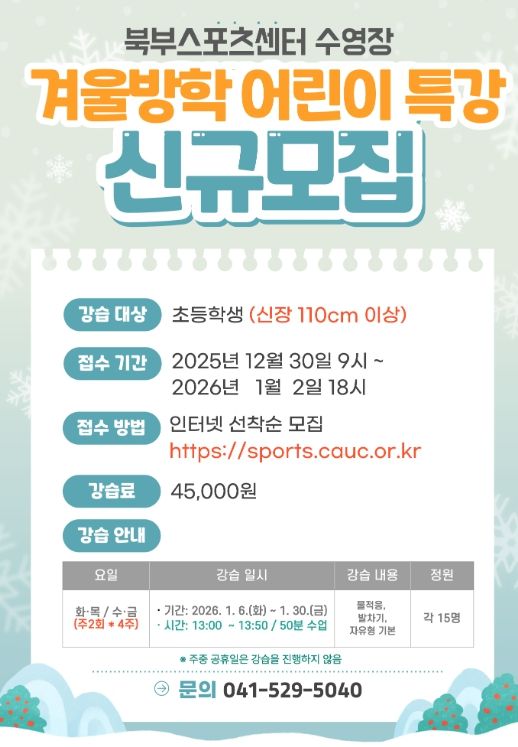 접수는 오는 30일 오전 9시부터 내년 1월 2일 오후 6시까지 북부스포츠센터 누리집에서 선착순으로 진행되며, 강습료는 4만 5,000원이다.