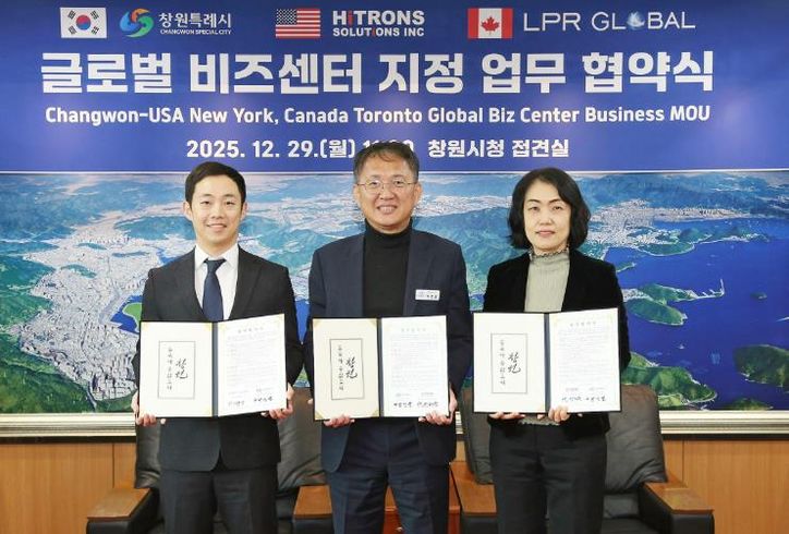 뉴한국방송뉴스통신사 신유철기자 기자 | 창원특례시는 29일 시청 접견실에서 미국 뉴욕의 HITRONS SOLUTIONS(하이트론스 솔루션)와 캐나다 토론토의 LPR GLOBAL(엘피알 글로벌)을 ‘창원시 글로벌 비즈센터’로 지정하는 업무협약(MOU)을 체결했다고 밝혔다.