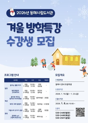 뉴한국방송뉴스통신사 양호선기자 기자 | 동해시는 2026년 겨울방학을 맞아 관내 초등학생을 대상으로 동해시립도서관에서 겨울방학 특강 프로그램을 운영한다고 밝혔다.