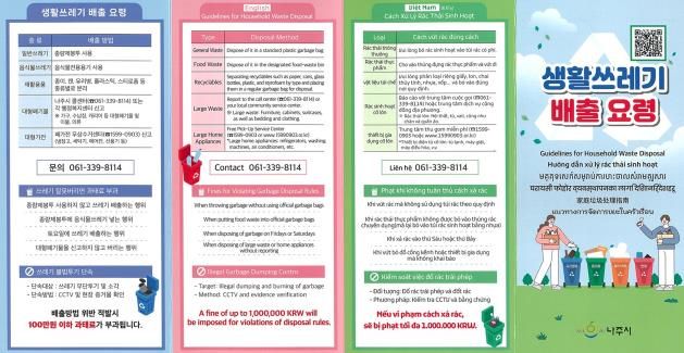 뉴한국방송뉴스통신사 신다은기자 기자 | 외국인 거주자와 근로자가 생활폐기물 배출 방법을 쉽게 이해하고 올바르게 실천할 수 있도록 나주시가 다국어 홍보물을 제작해 무단투기 예방과 쾌적한 도시환경 조성에 나선다.