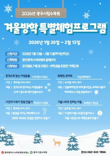 뉴한국방송뉴스통신사 김성의 기자 | 광주광역시 시립수목원은 어린이를 위한 ‘2026년 겨울방학 체험 프로그램’ 참가자 640명을 오는 13일 오전 10시부터 선착순 모집한다.