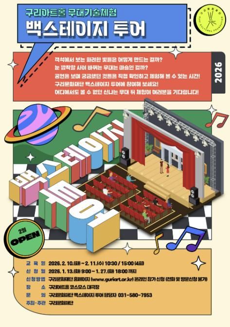뉴한국방송뉴스통신사 신유철기자 기자 | 구리문화재단은 〈무대 기술 체험 백스테이지 투어 프로그램〉 참가자를 오는 1월 13일 오전 9시부터 1월 27일 오후 6시까지 재단 홈페이지를 통해 선착순 모집한다고 밝혔다.