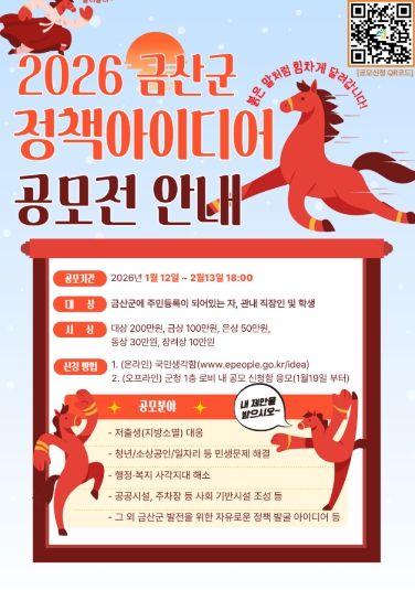 뉴한국방송뉴스통신사 신태공 기자 | 금산군은 군정 전반에 대한 참신한 정책 아이디어를 발굴하고 군민과 함께 지역의 미래를 설계하기 위해 2026년 금산군 정책 아이디어 공모전을 개최한다.